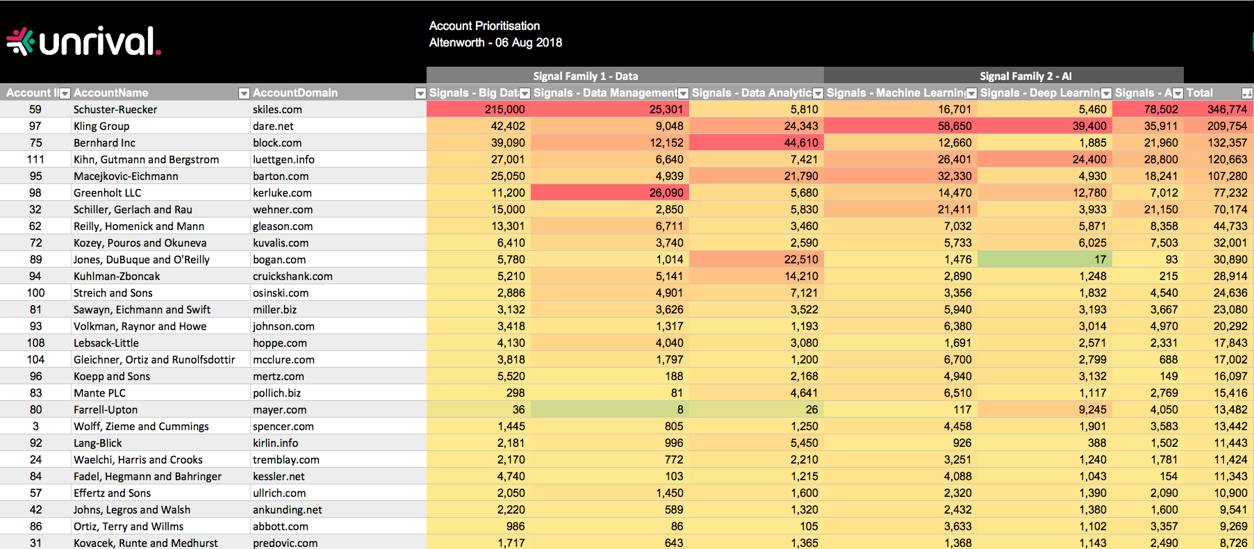 We use AI, Natural Language Processing and Machine Learning to uncover opportunities that no one else spots. For a long time companies have organised accounts by revenue, number of employees or other generic financial or operational metrics. Unrival has developed a unique solution which uncovers signals in accounts based on sophisticated keyword, content analysis and social listening.